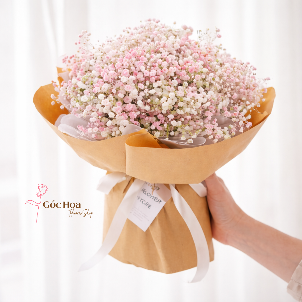 - Tên sản phẩm: Bó hoa baby hồng trắng gói giấy kraft
